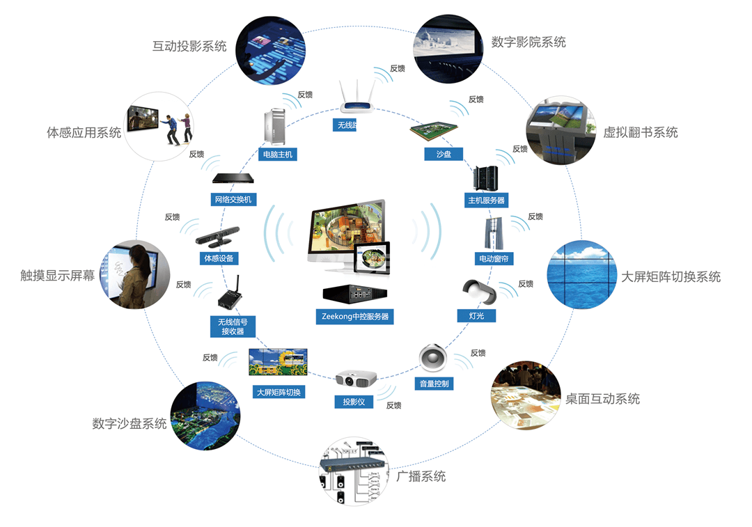隨著智能展廳的快速發展,如今對于展廳設備的控制需求變得越來越高,它不僅僅需要對多媒體設備的電源進行開關機控制,而且需要對多媒體內容進行播放控制、音量調節、燈光明暗調節,以及周邊的設備如窗簾、空調、辦公設備等進行無線管控。這就需要一個全新的智能化的中控系統來實現。